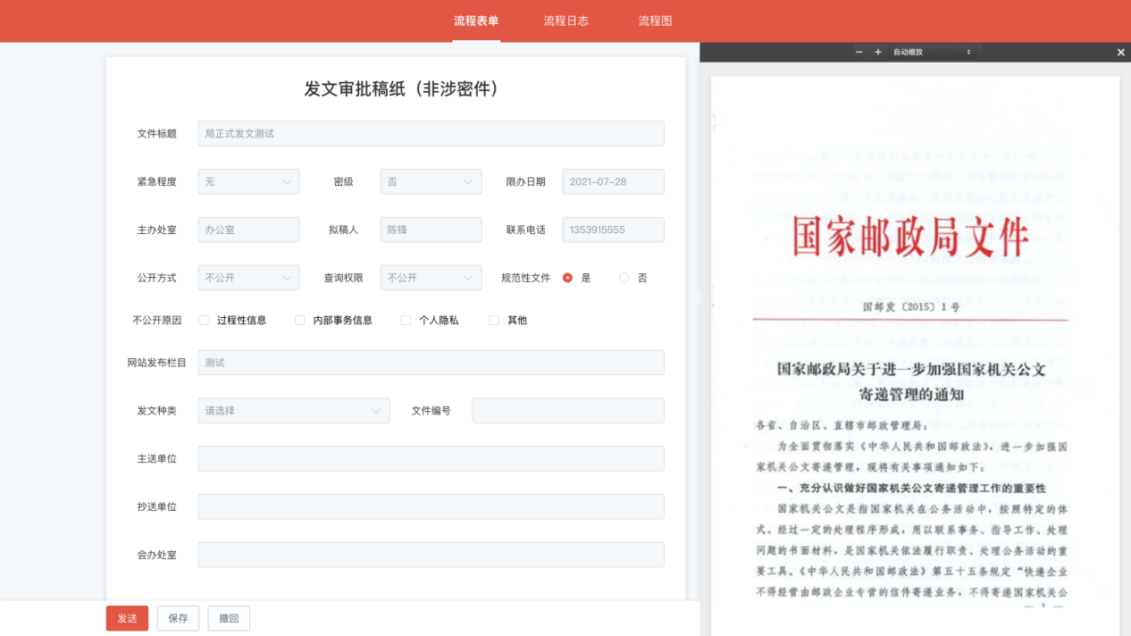 提供公(gong)文(wen)的(de)(de)收(shou)發(fa)、交(jiao)換、督辦、統計、檔(dang)案等(deng)管理(li),靈活支持收(shou)發(fa)文(wen)業務中(zhong)的(de)(de)草擬(ni)、會商、核稿、手(shou)寫簽(qian)名審批、簽(qian)發(fa)、收(shou)轉(zhuan)發(fa)、收(shou)文(wen)登記、收(shou)文(wen)擬(ni)辦、批辦、請(qing)辦、傳閱、打印(yin)、歸檔(dang)等(deng)公(gong)文(wen)處理(li),支持完整的(de)(de)公(gong)文(wen)管理(li)過程。