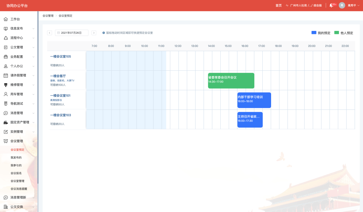 實現會議的(de)發起、安排、通知、報名(ming)、人數統計、會議室管(guan)理(li)、會議議題單、會議材(cai)料、會議結果等(deng)會前、會中、會后(hou)的(de)一體化流程。