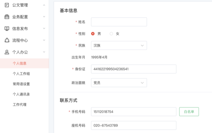 以用戶(hu)為角(jiao)度提供其個人信息(xi)設(she)置、賬戶(hu)管理(li)、工作組、常用語、通訊(xun)錄、委托辦理(li)、個人收藏(zang)、快捷辦文管理(li)。