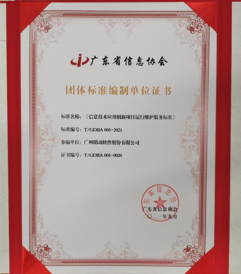 與此同(tong)時,明(ming)動軟件受邀參(can)與了(le)由廣東省(sheng)通(tong)信產業(ye)服務有(you)限公司聯(lian)合中通(tong)服建設(she)有(you)限公司、 工業(ye)(ye)和(he)信(xin)息化(hua)部電子(zi)第五研究(jiu)所、廣(guang)(guang)東廣(guang)(guang)信(xin)通(tong)信(xin)服務有(you)限公司、 廣(guang)(guang)東省信(xin)息工程有(you)限公司等企(qi)業(ye)(ye)、研究(jiu)機(ji)構共(gong)同成(cheng)立(li)的團體(ti)標準(zhun)(zhun)編制組,共(gong)同參與編制《信(xin)息技術應用創新(xin)項目運(yun)(yun)行維護服務標準(zhun)(zhun)》,為(wei)規范信(xin)創項目運(yun)(yun)行維護服務的實施,促(cu)進信(xin)創行業(ye)(ye)持續(xu)發展提供助力。不僅如(ru)此,明動還被評為“廣(guang)東省信息協會2021年度優秀會員”。