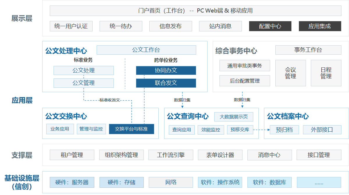 本方案以多租戶“按(an)需(xu)(xu)開通(tong)(tong)系(xi)(xi)(xi)統”的(de)(de)方式,采用微服務(wu)、模塊化的(de)(de)架構(gou),滿(man)足(zu)(zu)黨政(zheng)機(ji)關(guan)的(de)(de)公(gong)(gong)(gong)文處理中(zhong)心(xin)(xin)(xin)、公(gong)(gong)(gong)文交換中(zhong)心(xin)(xin)(xin)、公(gong)(gong)(gong)文查詢中(zhong)心(xin)(xin)(xin)、公(gong)(gong)(gong)文檔(dang)案中(zhong)心(xin)(xin)(xin)和(he)綜合事務(wu)中(zhong)心(xin)(xin)(xin)的(de)(de)“4+1”中(zhong)心(xin)(xin)(xin)體系(xi)(xi)(xi)需(xu)(xu)求(qiu),滿(man)足(zu)(zu)客戶“廣覆(fu)蓋、快(kuai)部署、靈活用”的(de)(de)場(chang)景,以“標準(zhun)+定制(zhi)”一體化系(xi)(xi)(xi)統實(shi)現省、市、區縣(xian)、街、村等(deng)5級區域覆(fu)蓋,充(chong)分解(jie)決了(le)黨政(zheng)單位/部門“辦(ban)(ban)公(gong)(gong)(gong)系(xi)(xi)(xi)統繁雜、架構(gou)參差、系(xi)(xi)(xi)統不穩定、信(xin)息不通(tong)(tong)、信(xin)息冗(rong)余”等(deng)辦(ban)(ban)公(gong)(gong)(gong)協(xie)作問題,切實(shi)提升了(le)黨政(zheng)單位之間辦(ban)(ban)公(gong)(gong)(gong)效率和(he)協(xie)作能(neng)力,得到了(le)廣大客戶的(de)(de)認可(ke)。